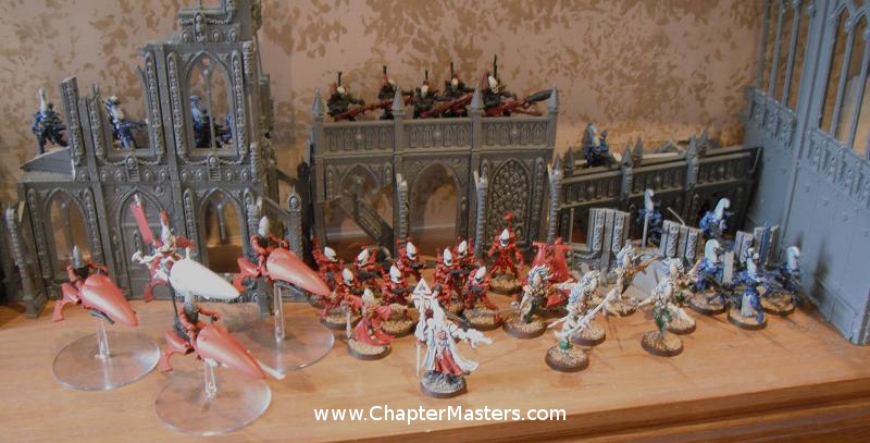 This small Eldar army just makes 1000 points. The HQ is an improvised Autrach using a plastic dire avenger model on a jetbike. A Metal Farseer adds a second HQ and psychic support. The troops section is formed by two Dire Avenger squads, a five man squad with plastic Exarch and a 6 man squad using the old metal exarch (in the runins). A 10 man (or woman) Guardian squad with a Star Cannon and Warlock makes a third troop choice and a 3 man jet bike squad makes up a final troop choice. The Heavy Support consists of a five man Dark reaper squad with Exarch, these are good anti marines weapons with their AP3 reaper lunchers. The Exarch has a Missile Luncher to add some anti tank support, which this army is not strong on. Finally the Fast attach section comprises of a 6 woman Howling Banshee adding their some close combat ability.