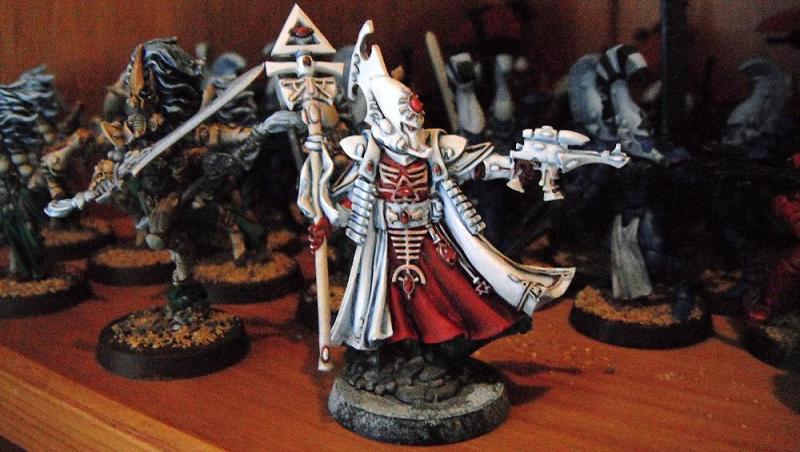 A farseer with Witch Staff and Shuriken Pistol is an esential unit for the Eldar. The Fortune and Guild powers can be used to bolster the abilities of either the dire avengers or Guardians. This model was given a white undercoat. Blue ink has been painted into the resessused to create shading. The red is a Merchant Red Scorched Brown mix, worked up with Beached Bone.